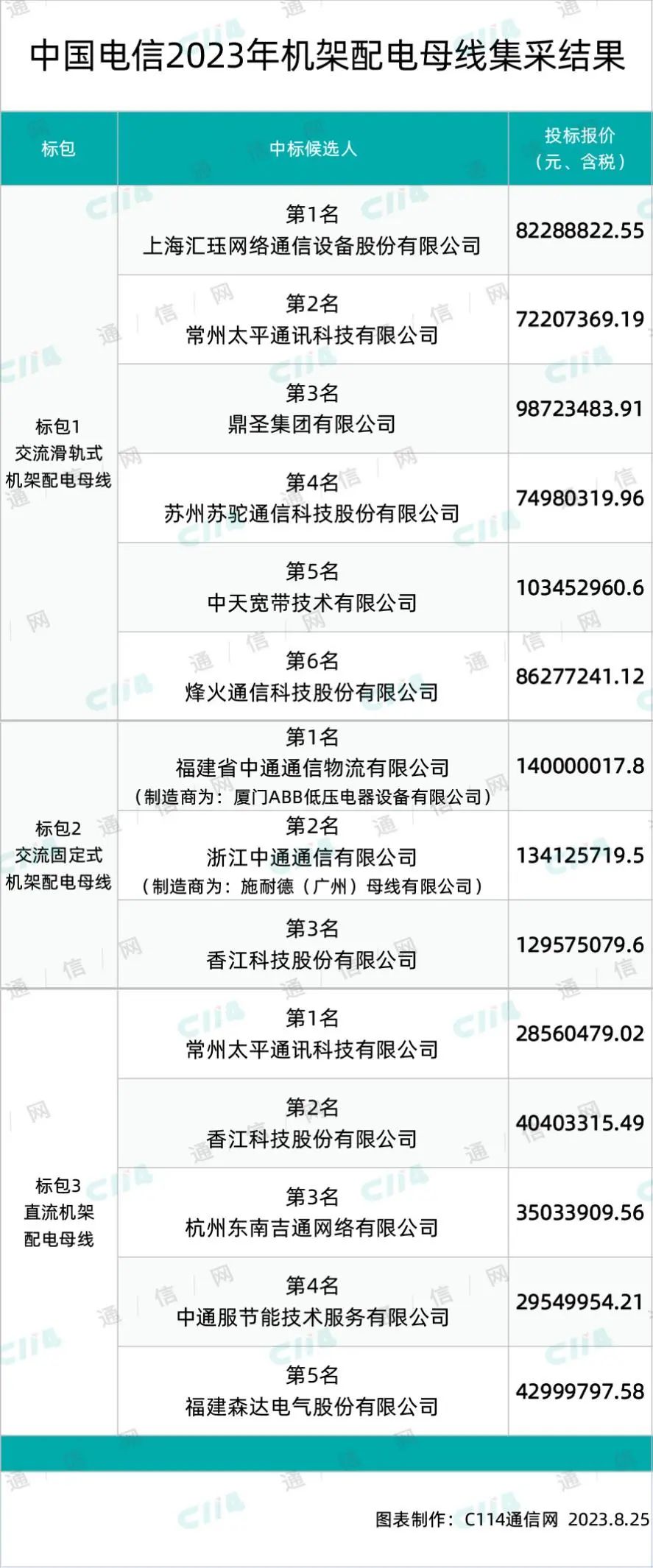 C114新闻8月25日讯(娇娇)从中国电信官网获悉,中国电信近日公布了2023年机架式配电母线集中采购项目中标企业,汇桔、太平、中天、烽火等12家企业入围。