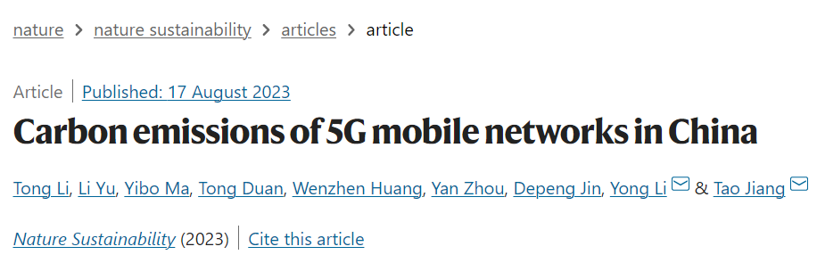 近日,中国移动研究院与清华大学电子系合作研究成果《中国5G移动网络碳排放》研究论文发表在《自然可持续发展》杂志上,影响因子为27.7。