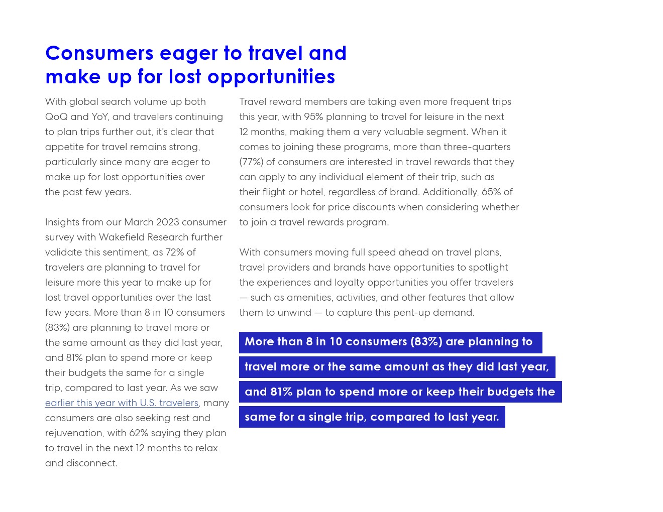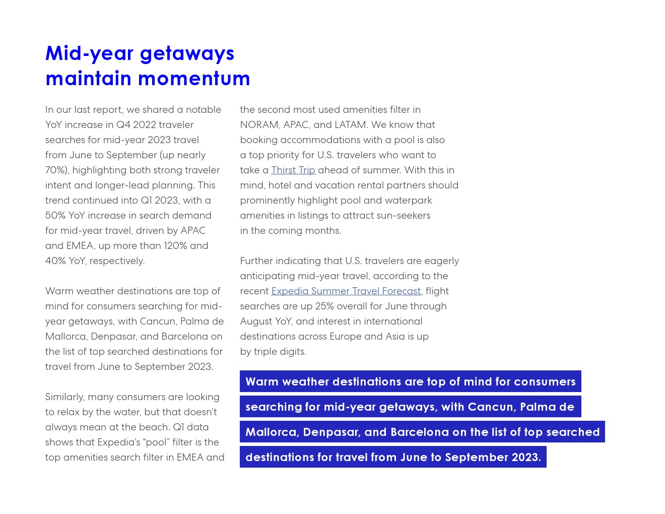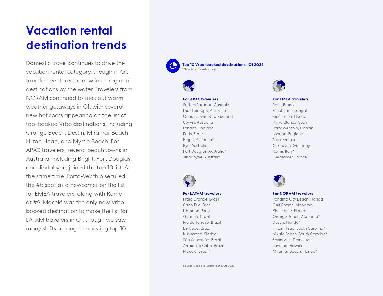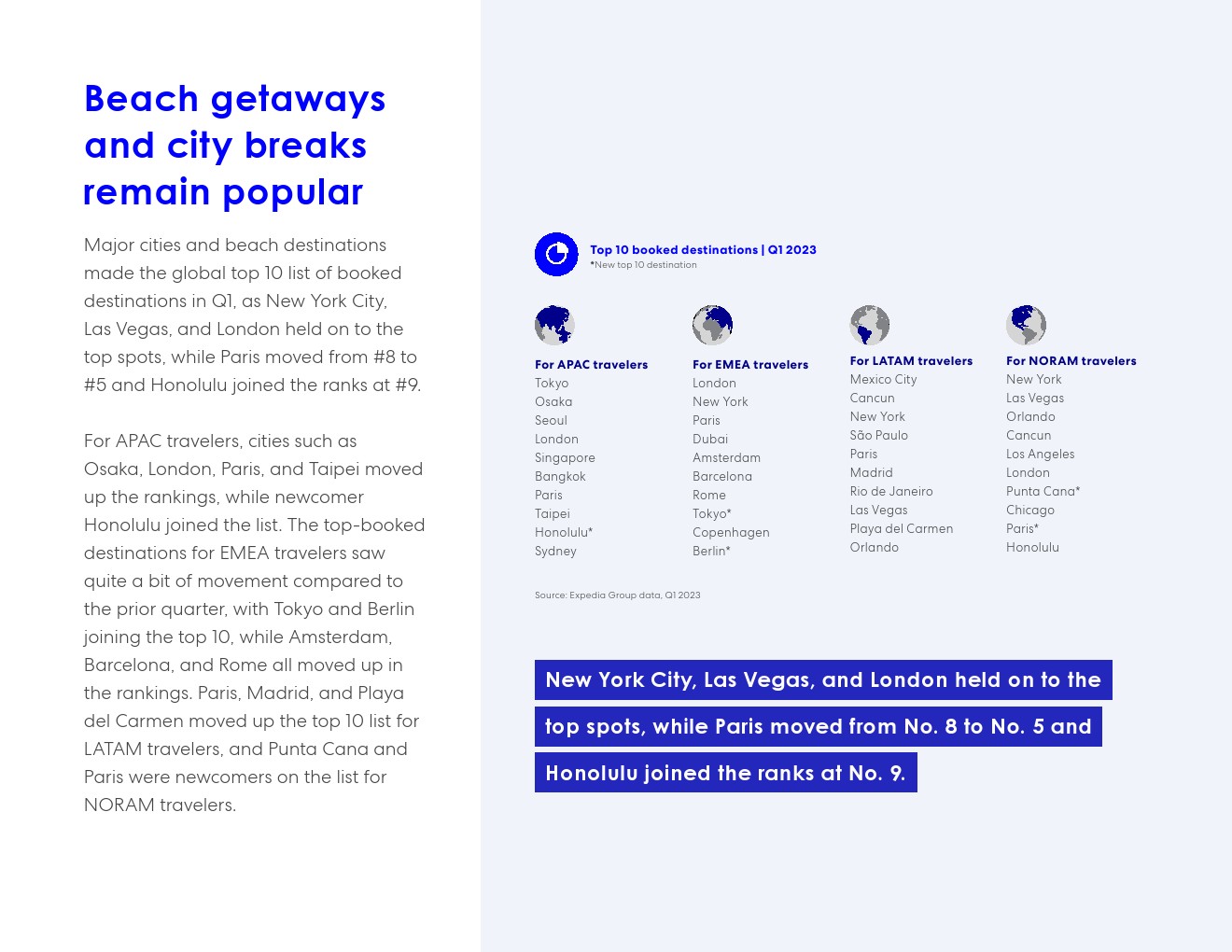 在季节趋势、情绪变化、边境开放和许多其他因素的影响下,游客在搜索、规划和预订旅行方面的行为持续波动。每个季度,Expedia都会分享不断变化的游客意向和需求,而这些数据来自于数亿游客访问其旅游网站的第一手数据。