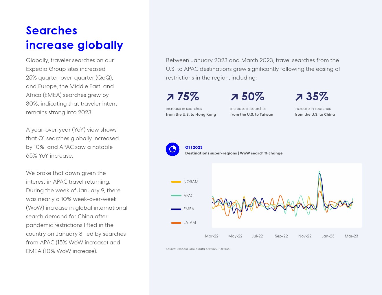 在全球范围内,Expedia网站上的游客搜索量环比增长了25%,欧洲、中东和非洲(EMEA)的搜索量增长了30%,这表明游客的意愿在2023年仍将保持强劲。