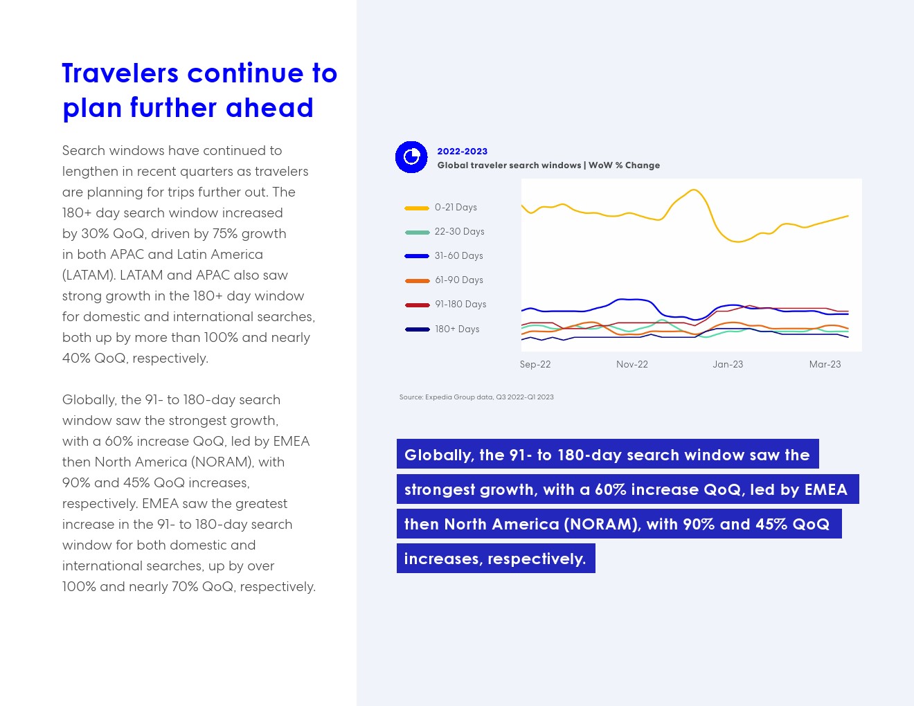 最近几个季度,随着游客计划去更远的地方旅行,搜索窗口继续延长。超过180天的搜索窗口环比增长30%,其中亚太地区和拉丁美洲(LATAM)增长75%。拉丁美洲和亚太地区的国内和国际搜索量也在180多天内呈现强劲增长,环比增幅分别超过100%和近40%。