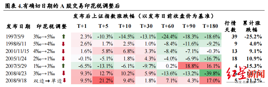 中银证券的研究报告显示,在7次有明确发布日期的印花税调整中,2次印花税上调均引发市场下跌,5次印花税下调均在长期下跌、市场低迷的熊市中催化了明显的短期价格上涨。