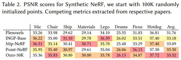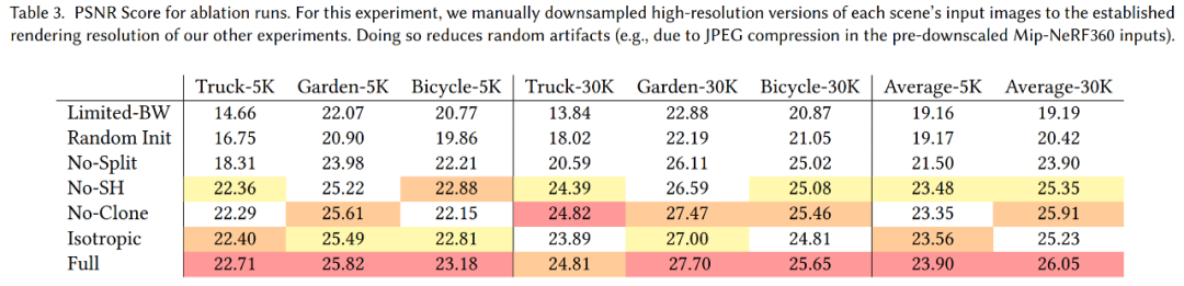 研究小组将不同的贡献和算法选择分开,并建立了一组实验来衡量它们的效果。该算法的以下方面被测试:SfM初始化、致密化策略、各向异性协方差、允许无限数量的面片具有梯度以及球谐函数的使用。下表总结了每个选项的量化效果。
