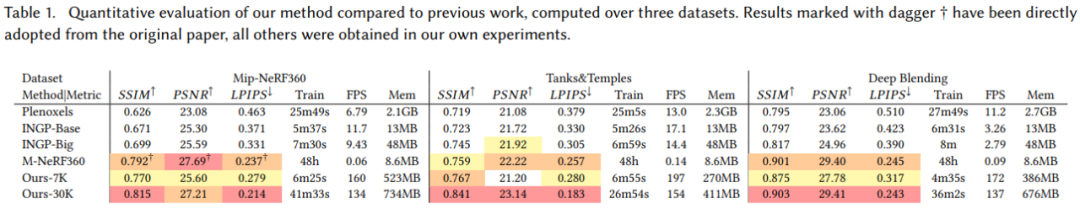 研究团队采用了Mip-NeRF360建议的方法,将数据集分为训练和测试两部分,每8张照片测试一次,进行一致且有意义的比较,从而生成误差指标,并使用了文献中最常用的标准PSNR、L-PIPS和SSIM指标。详细数据见表1。