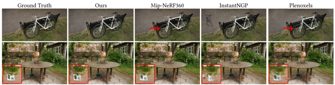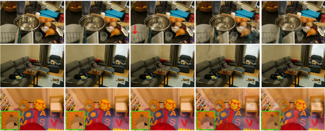 场景从上到下分别是来自Mip-NeRF360数据集的自行车、花园、柜台、房间。来自深度混合数据集的游戏室(更多对比请阅读原文)。图中已经标注出了不同方法产生的明显差异,比如自行车的辐条,远离花园的房屋的玻璃,铁筐的杆子,玩具熊。