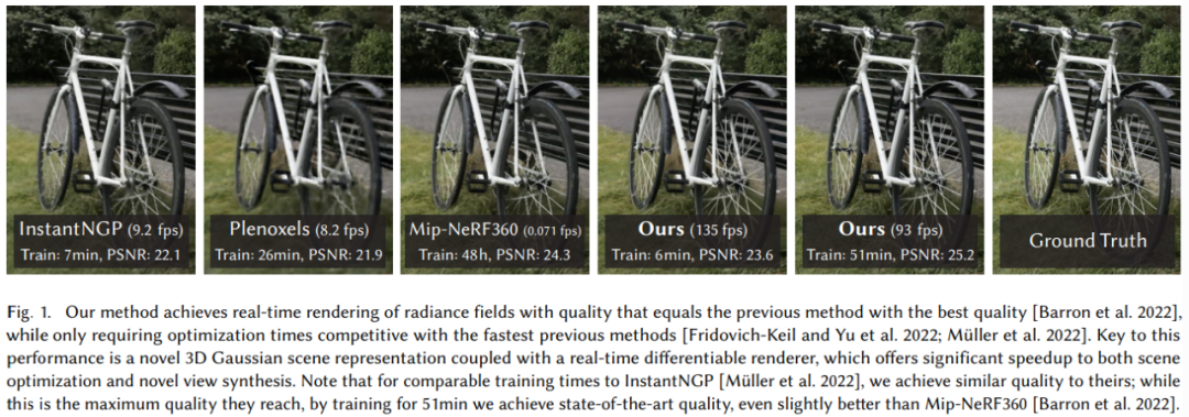 研究团队设定了一个目标:实时渲染多张照片拍摄的场景,在典型真实场景中实现时间优化。此前,虽然Fridovich-Kei等人提出的方法已经实现了快速训练,但很难达到当前SOTA NeRF方法获得的视觉质量,该方法需要长达48小时的训练时间。也有研究提出了一种快速但低质量的辐射场方法,可以根据场景实现交互式渲染(每秒10-15帧),但这种方法无法实现高分辨率的实时渲染。