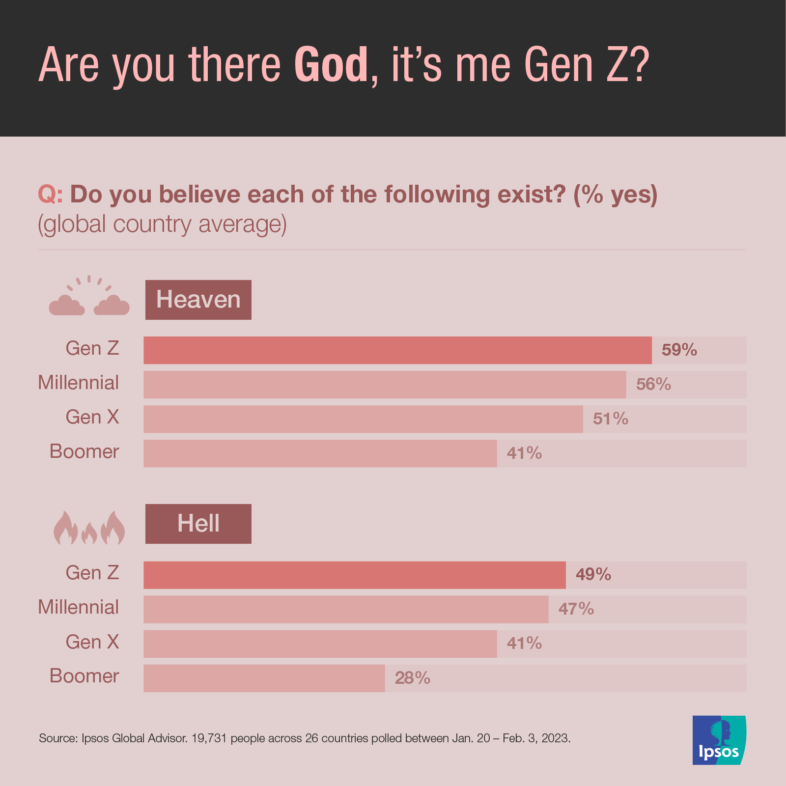 益普索最近在26个国家进行的民意调查发现,近三分之一的Z世代人(26个国家的31%和婴儿潮一代的37%)表示他们从不去礼拜场所,但与老年人相比,更高比例的人相信上帝/更高的权力(64%,婴儿潮一代的55%),天堂(59%,婴儿潮一代的41%)。