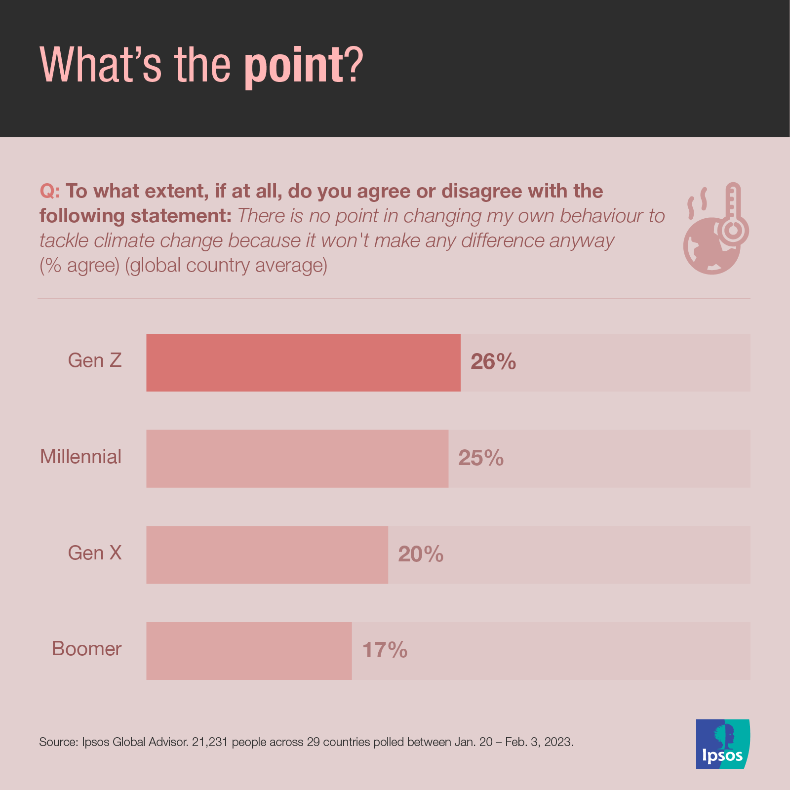 Z世代经常被媒体描绘成历史上最环保的一代,但益普索在2023年地球日进行的一项民意调查发现,在这个已经受到气候变化严重影响的世界上,约有四分之一的人对采取行动非常悲观。