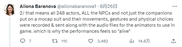 “这意味着所有的248名演员,所有的NPC,不仅仅是他们的同伴,都穿上了运动服。他们的动作、手势和身体选择都被记录下来,并与音频文件一起发送给动画制作人,供游戏使用。这就是为什么游戏里的表演都这么‘活’的原因。”