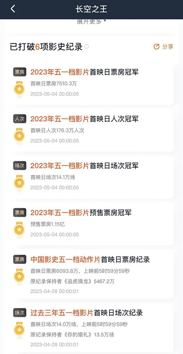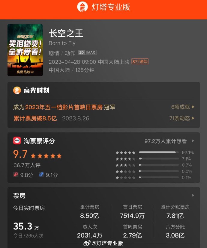 据《灯塔行》专业版报道,电影《天空之王》从4月28日到8月27日经历了121天的“飞行”,最终获得8.5亿元票房。《天空之王》共获得6项电影历史纪录,包括2023年五一电影预售票房冠军、2023年五一电影票房冠军、人数和场次、电影史上五一动作电影票房纪录。