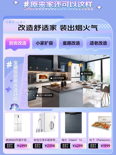 如今,90后、00后成为消费主力,无忧一站式购买家电、家居产品成为消费新趋势。本次秋季家装节重点关注客厅、卧室、卫生间、厨房、阳台等场景。根据不同消费者喜好,打造厨房改造、小家拓展、童趣改造、老年改造等14大潮流场景,让消费者快速选购家电。比如在厨房改造潮流场景中,60 cm超薄嵌入式奥马冰箱、海尔14台大容量嵌入式洗碗机、常棣家用电烤箱、天使净水器、松下多功能锅等,不仅能彻底解放消费者的双手,还能为消费者营造更舒适的厨房环境。