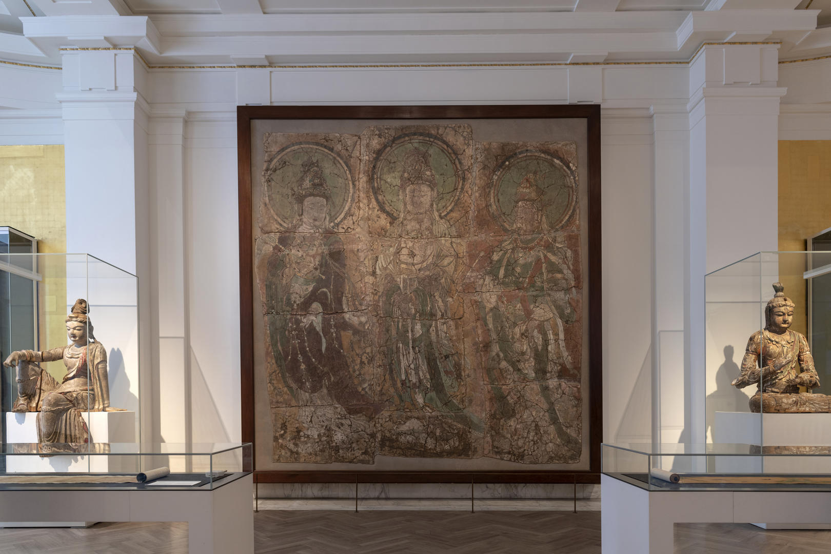 大英博物馆33号展厅为专门陈列中国文物的永久性展厅,此为中国馆内展出的河北省行唐县明代清凉寺壁画和辽代三彩罗汉。图据视觉中国