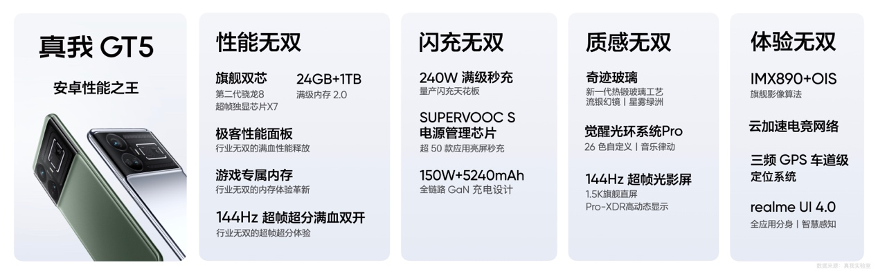 作为真我五周年的代表作,真我GT5为用户带来了第二代骁龙8、24GB+1TB满级内存、240W满级二次充电的顶级性能组合,是全行业唯一的性能配置。此外,真我GT5还配备了质感无与伦比的奇迹玻璃,旗舰体验充满维拉曼气息。真我GT5是史上最强真我手机,带给用户安卓性能之王的巅峰体验。