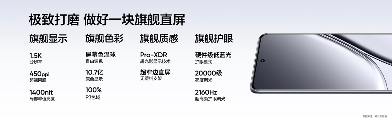 旗舰质感,不止一面。真我GT5正面配备6.74英寸144Hz超帧光影屏,无塑料支架设计,边框最窄处仅1.46mm;全新支持Pro-XDR高动态显示,在浏览相册中高动态范围的图片时,最高可激发8倍动态范围,全面还原动态范围和明暗细节;同时,屏幕具有全局护眼功能,配备2160Hz UHF PWM调光和20000级亮度等级,支持色温自由定义和调节,显示更精准。