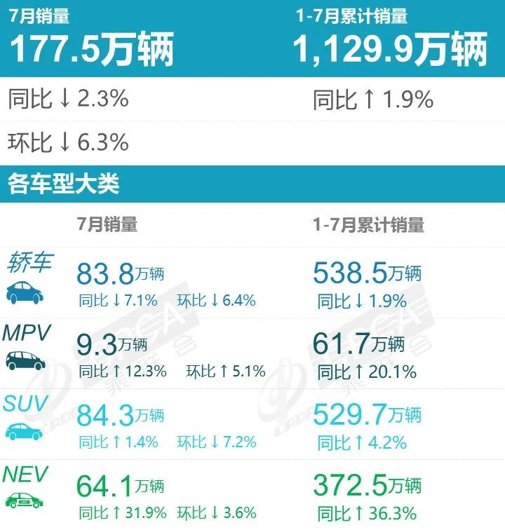 中国汽车流通协会汽车市场研究分会(协会)最新零售统计数据显示,7月国内狭义乘用车市场零售量达到177.5万辆,同比下降2.3%,环比下降6.3%。1-7月累计销量1129.9万辆,同比增长1.9%。
