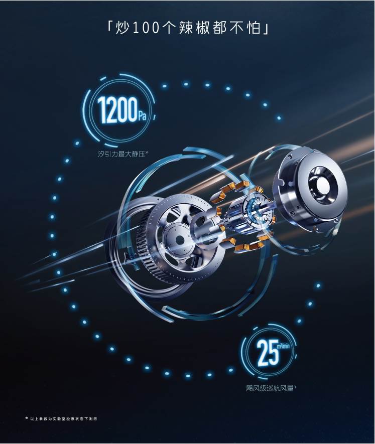 在油烟机结构上,火星X5 Pro采用第三代高性能变频电机,最大巡航风量可达25m3/min,并有1200Pa的强劲风压。如此高的配置再一次打破了行业性能的天花板。要知道,目前市面上的主流产品,风量大多在15-20m3/min之间,风压在1000Pa以上。