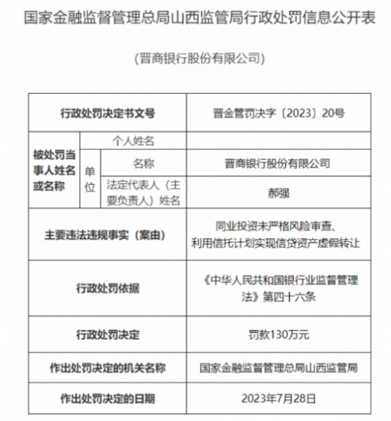 值得一提的是,7月28日,晋商银行被国家金融监督管理总局山西监管局罚款130万元,原因是其同业投资未经过严格风险审查,利用信托计划实现信贷资产虚假转让的违法事实。