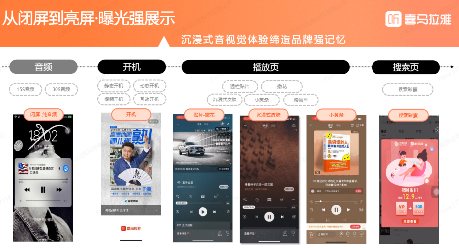 品牌通过内容共创、播客营销、嗨马听榜、嗨马超级话题等特色产品,精准定位不同受众,以原创生化内容触达意向受众,充分发挥营销号召力,实现品牌价值的广泛传播。喜马拉雅广告通过拦截用户关键路径,以音流的形式推出组合产品,有效提升广告转化效果,让传播“声”进入人心,把握营销“关键时刻”。喜玛拉雅从全场景触达流量,为品牌构建全面定位。早上自驾通勤、周末出行、亲子陪伴等日常生活,通过强视觉曝光、音频闭屏接入、亮屏追求,在APP端、音箱端、车载端反复触达用户,用沉浸式空间营造有趣互动、深植草的氛围体验。