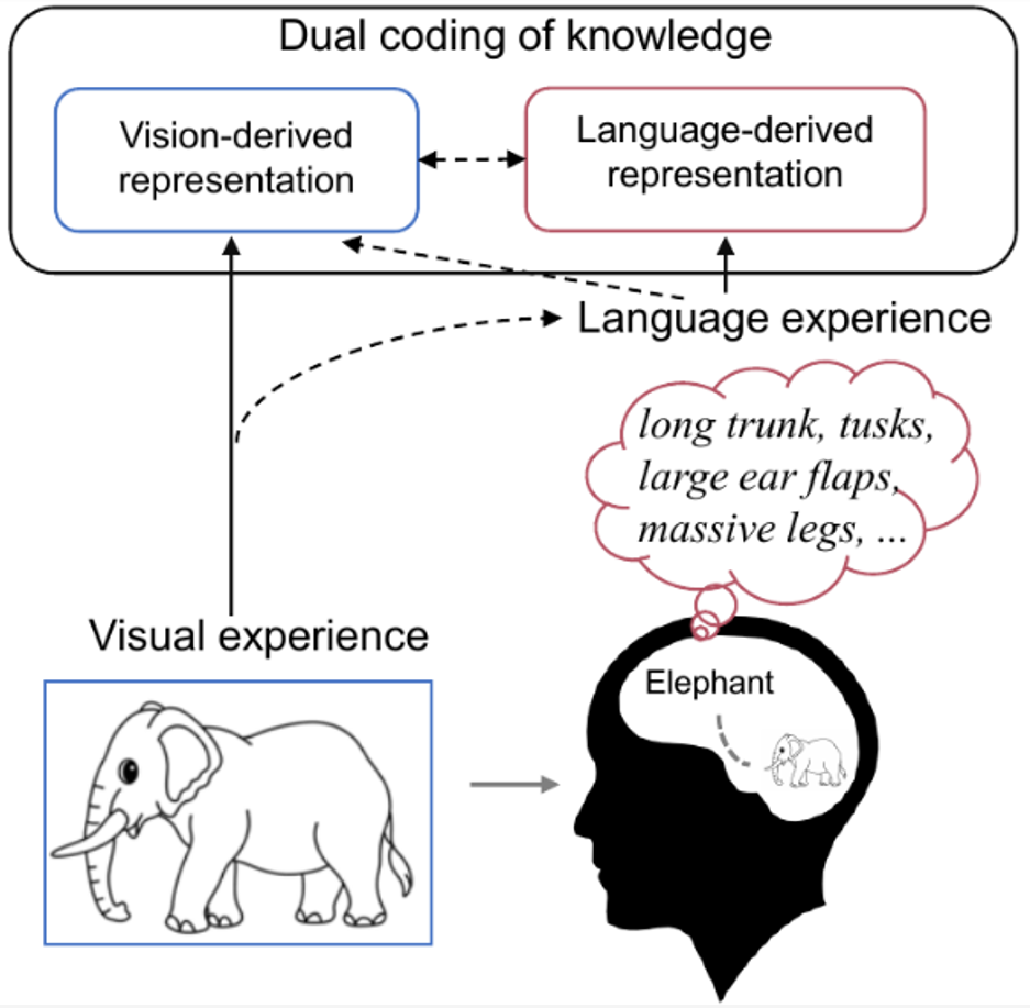 研究表明,人类对视觉刺激的感知和识别受到视觉特征和人们先前经验的影响。当我们看到一个熟悉的物体时,我们的大脑会自然而然地检索到与该物体相关的知识。比如我们看到大象的图片,自然会检索到大象的相关知识(比如长鼻子、长牙齿、大耳朵等。)在我们心目中。这时,大象的概念会在大脑中以视觉和语言的形式进行编码(双重编码),其中语言作为一种有效的先前经验,有助于塑造视觉产生的表征。因此,作者认为,为了更好地解码记录的脑信号,不仅要使用实际的视觉语义特征,还应该包含与视觉目标对象相关的更丰富的语言语义特征的组合进行解码。