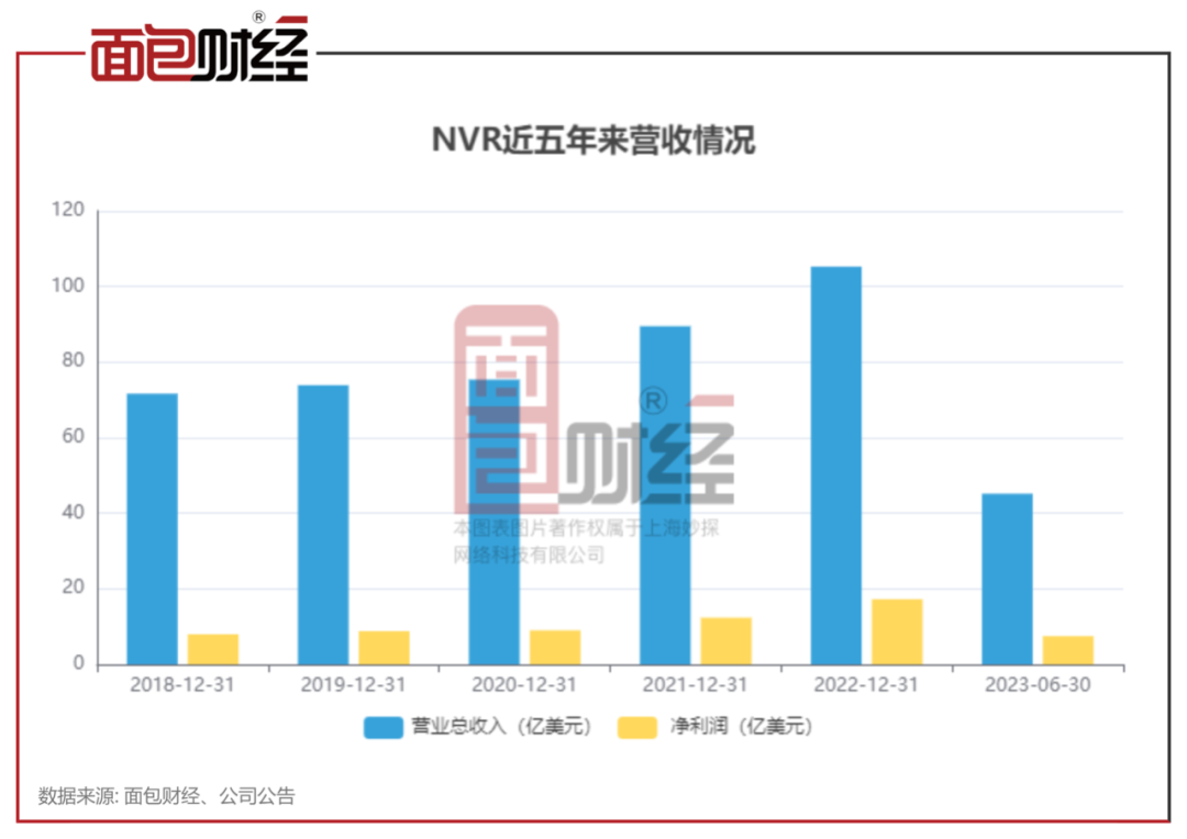 最新财报显示,2023年上半年,NVR营业收入45.17亿美元,同比下滑10.34%;净利润为7.48亿美元,同比下降12.92%。近年来,公司业绩首次出现下滑。