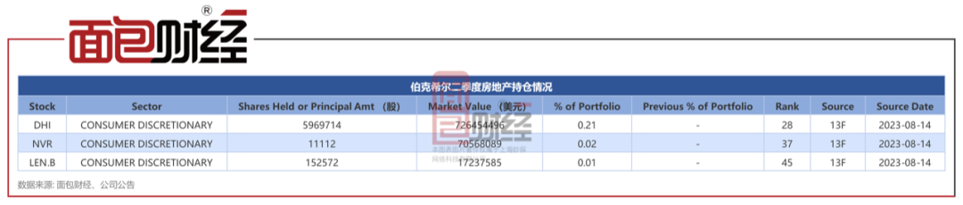 具体来说,在今年第二季度,Berkshire收购了美国房地产开发商DHI。美国,持股596.97万股,期末市值7.26亿美元。此外,该公司还新收购了NVR(NVR。美国)和公共住房建筑商LEN。b .美国,分别持有1.1万股和15.26万股,市值分别为7056.8万美元和1723.7万美元。这三只地产股的总持仓达到8.14亿美元。