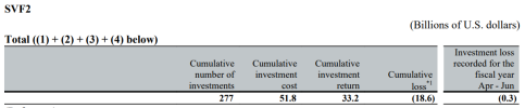 远景二期承诺投资600亿美元。截至6月30日,共投资项目277个,耗资518亿美元。被投公司整体估值332亿美元,整体账面亏损186亿美元。
