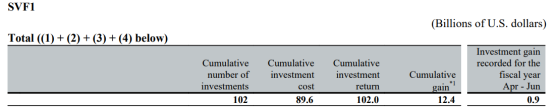 截至2023年6月30日,远景一期共投资102个项目,投资成本896亿美元,整体估值1020亿美元,账面利润124亿美元。