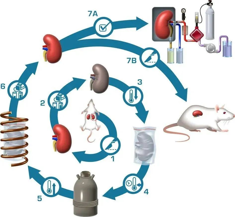 2002年,美国的研究人员首次对兔子的器官进行了冷冻移植实验。他们先是将兔子肾脏进行玻璃化冷冻,升温后又将其植入了另一只兔子体内。