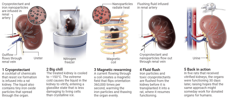 自2018年以来,这些研究人员成功冷冻并复活了珊瑚、果蝇幼虫,以及斑马鱼胚胎。而在这篇最新的成果中,他们首次成功移植了玻璃化冷冻100天后,又经过氧化铁纳米颗粒加热复原的老鼠肾脏。