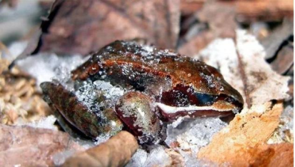 为了度过当地的寒冬(能达到零下16℃以下),这种棕色的林蛙不能只靠像普通的青蛙那样躲在水底或洞穴里冬眠的方式,还得发挥出自身的黑科技——蛙体冷冻。