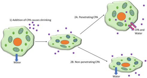 当置于高浓度保护剂中的细胞的细胞液与保护剂达到动态平衡后,细胞体积会因脱水而缩减30-50%。之后,将其置入液氮中使其瞬间玻璃化。