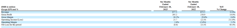近日,博世音乐发布了截至2023年2月28日的2023财年半年报,营收9.78亿元,同比增长11.9%,净亏损880万元,同比下降8.4%。