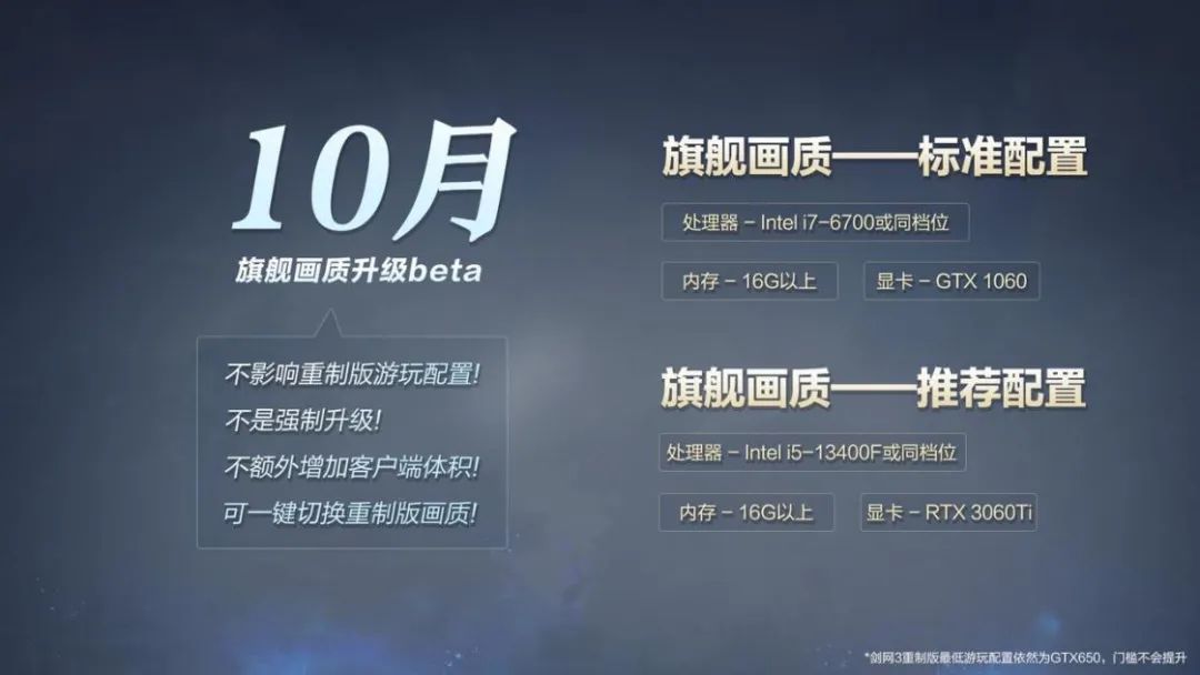 另外为了尽量降低老玩家的体验门槛,旗舰画质的接入配置不高,GTX1060显卡可以玩游戏,GTX650的最低配置门槛也不会提高。玩家可以根据自己的喜好和配置在旗舰版和重制版画质之间切换。而且由于旗舰版不走复制模型的路子,而是升级材质,改变渲染方式,不会增加客户端的体积,200G的传闻不攻自破。