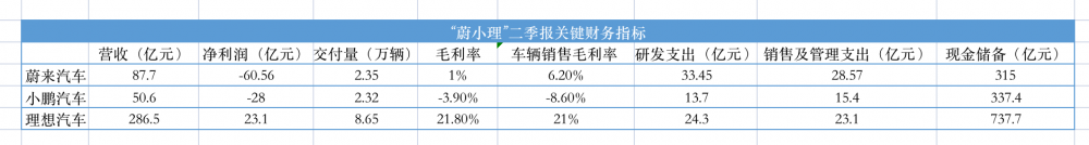 报告期内,三家车企的盈亏不同,也有不同的内在因素。今年第二季度,蔚来汽车销售毛利率从去年同期的16.7%降至6.2%,小鹏从9.1%降至-8.6%。理想差不多,从去年同期的21.2%到21%。报告期内,蔚来、小鹏和理想公司的毛利率分别为1%、-3.9%和21.8%,去年同期分别为13%、10.9%和21.5%,其中理想毛利率已连续两个季度超越特斯拉。