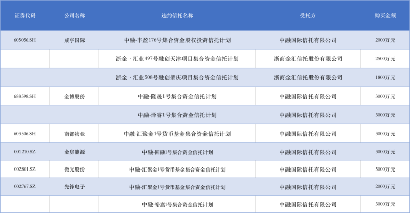 金方能源(001210。SZ)8月18日公告称,涉及的中融-荣源1号集合资金信托计划逾期,公司认购3000万元。22日,微光股份(002801。SZ)发布公告称,公司认购的5000万元中融-汇金金1号货币基金集合资金信托计划(以下简称“汇金金1号”)到期。同日,先锋电子(002767。SZ)也发布公告称,部分信托产品出现逾期,包括汇金金1号、中融-鱼枷1号集合资金信托计划,公司认购金额分别为2000万元和3000万元。