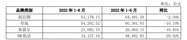 据披露,华熙生物的功能性护肤品主要分为润百颜、夸迪、米贝尔、BM肌活,四个品牌上半年收入同比均有所下降。BM肌肉活性下降最多,达29.62%。润百颜收入最高,约6.32亿元,同比下降2.04%。