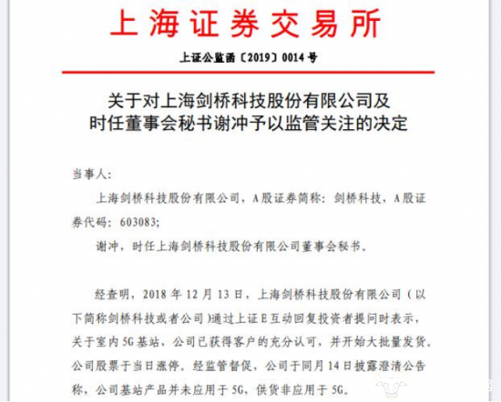 原因是2018年12月13日,有投资人在互动平台上向剑桥科技提问“目前有哪些有意向与公司合作的客户?室内5G基站是否得到客户认可”。剑桥科技回复投资者称,公司已获得客户对室内5g基站的充分认可,并开始大批量交付。