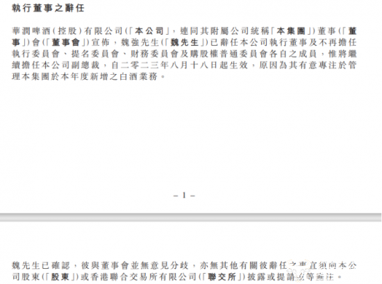 对于魏强的辞职,华润啤酒表示,原因是他打算专注于管理集团今年新增的白酒业务。
