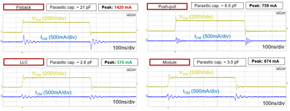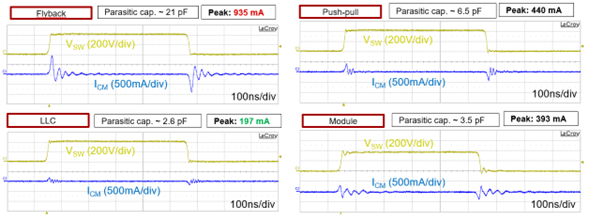 测量结果表明,在40V/ns和100V/ns压摆率下,反激变压器的共模电流分别为935mA和1,420mA。由于变压器的寄生电容,这是意料之中的。由于LLC转换器的寄生电容,测得的共模电流(40V/ns和100V/ns压摆率时为197mA和570mA)为实测值。大共模电流尖峰是有害的,因为它会将噪声从高压域传导到低压域,导致接地反弹;它还可能导致转换器运行不良,包括脉冲跳跃、调节丢失或意外关断。