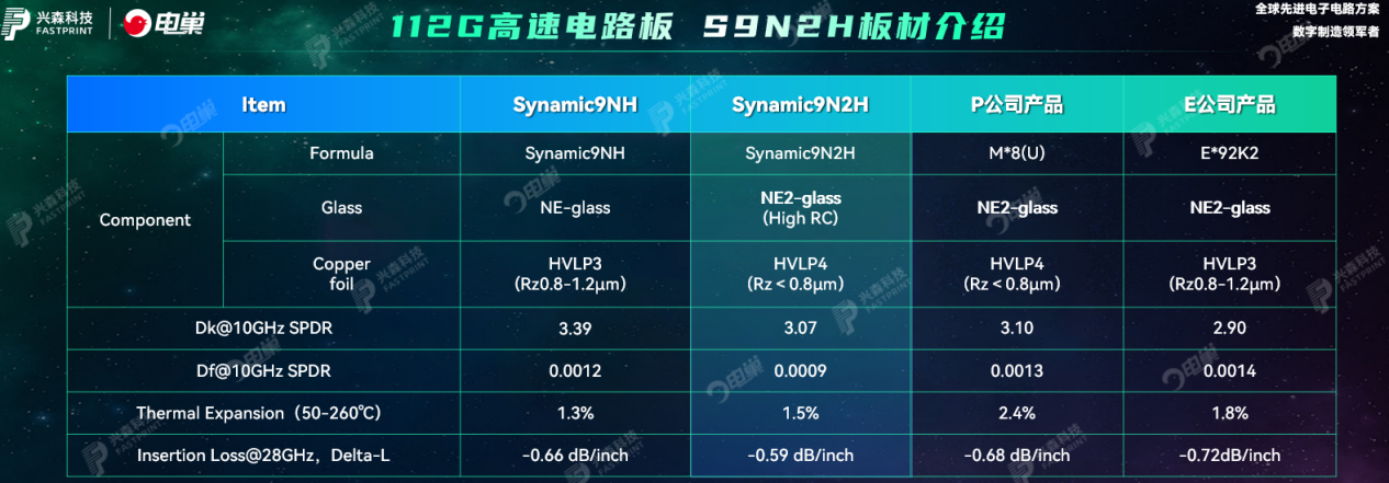 以艺声科技S9NH板为例,这是一种超低损耗、高多层、高可靠性的电路板基板。与业界同类产品相比,热膨胀系数更低,介电性能更好。使用NE-glass作为增强材料时,S9NH可以达到P公司产品使用的NE2-glass的插入损耗水平。目前行业内NE2-glass供货不足,S9NH有更好的供货和成本优势。S9N2H采用NE2-glass和高RC的方案,在测试中表现出112G+或接近224G应用的水平,并在国内各大终端公司进行了认证和测试。