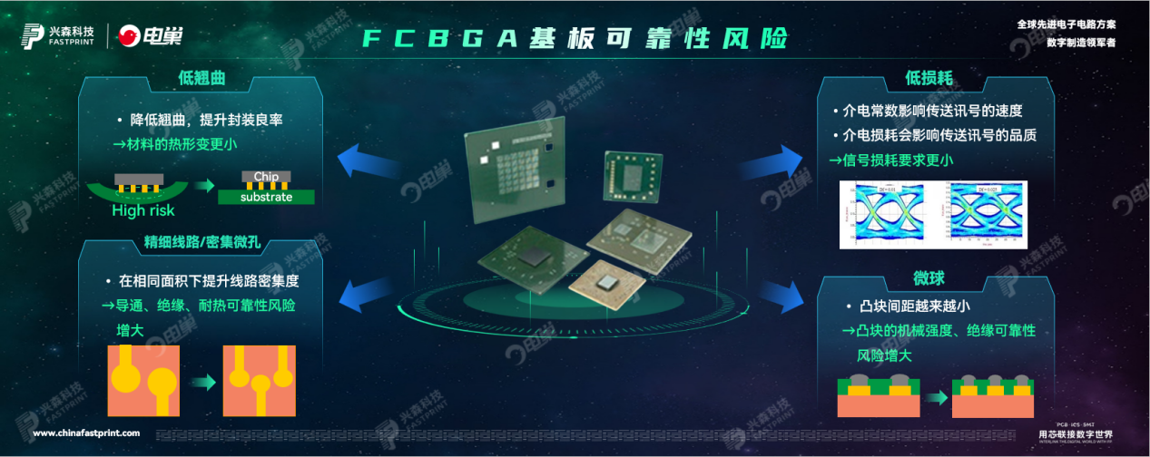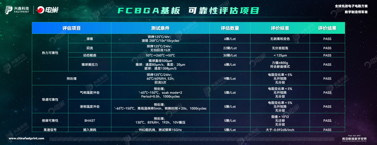 以下面的兴森7+2+7 FCBGA产品板为例,该产品板通过了热变形风险、导通可靠性、绝缘可靠性的严格严格测试。目前裸基板和封装已经通过可靠性测试,实现量产。