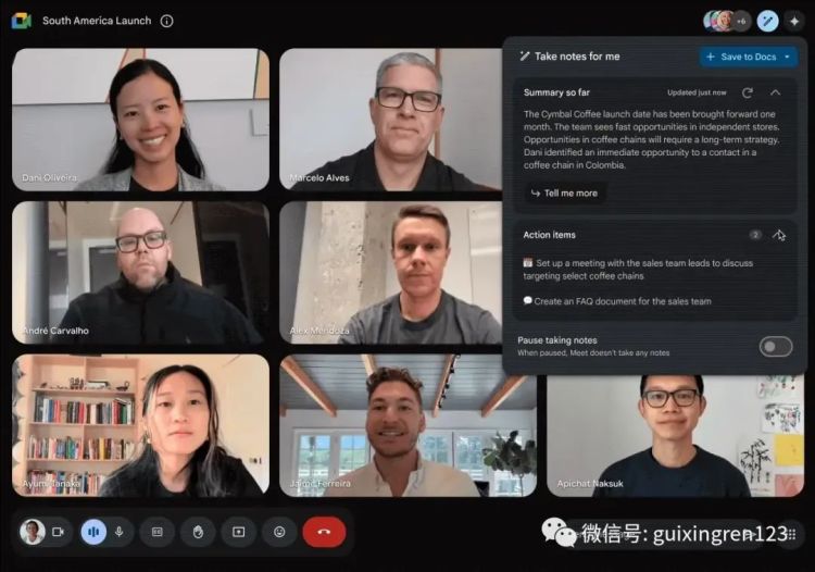 首先Duet AI推出了“替我做笔记”功能,可以实时抓取笔记、动作项目、视频片段。这些笔记可以保存在谷歌文档中,并在会后作为总结发送给与会者。如果迟到,还可以在进入会议后看到AI整理的“目前为止的总结”来快速了解会议内容后再参加。