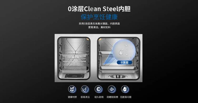 人类发明了清洁钢丝球,但是很多厨具却不能用它来清洁?这是什么反人类的设计!妈妈总是担心钢珠会划伤蒸烤箱的内胆,效率太低,耗费时间太多。而且蒸的过程无法避免高温高压高湿,内胆容易起泡甚至脱落,不仅难以打理,还可能影响熟食的健康。