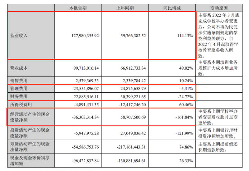 上半年,凯文教育的主要开支进一步减少。其中,管理费用2355万,同比下降5.31%;财务费用2289万元,同比下降24.72%。这并不是这两项费用的第一次减少。目前,这两个数据水平比疫情开始的2020年分别降低了42%和31%。这在一定程度上缓解了利润压力。