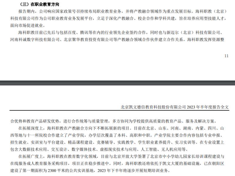到今年上半年,凯文教育透露,旗下职业教育业务拓展平台海科职业教育已与北京、山东、河南、湖南、内蒙古、四川、山西等地的十一所高校合作建立了产业学院,涵盖本科、高职、中职。同时,海科职教在朝阳区建设了首个面积达2300平方米的公共实训基地,并将于2023年下半年逐步开展短期培训业务。凯文教育在回答投资人提问时提到,公司在部分学院开设了人工智能、虚拟现实、大数据等新兴专业,并开设相关课程。