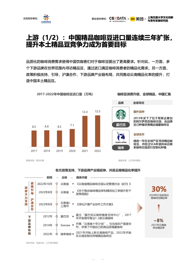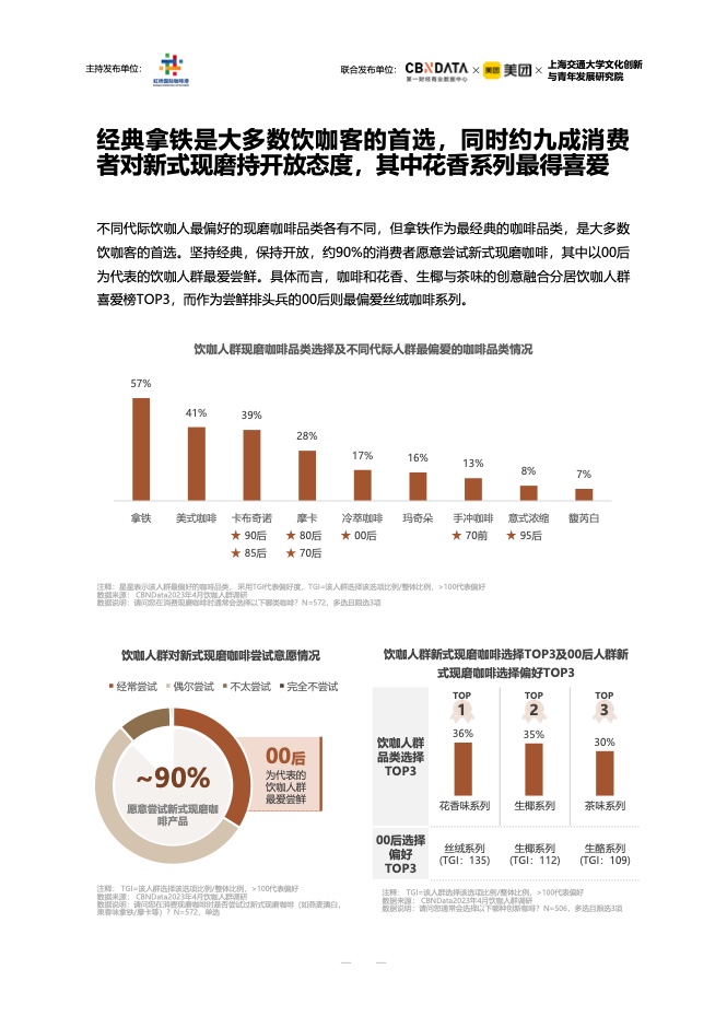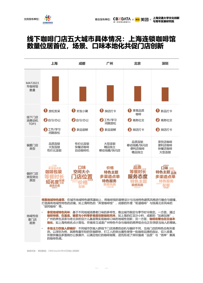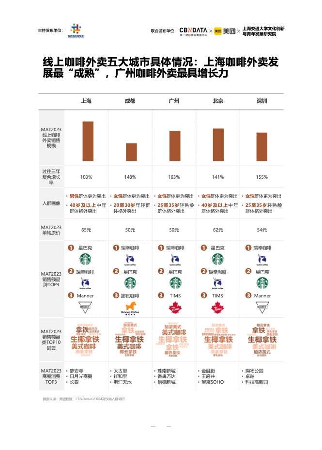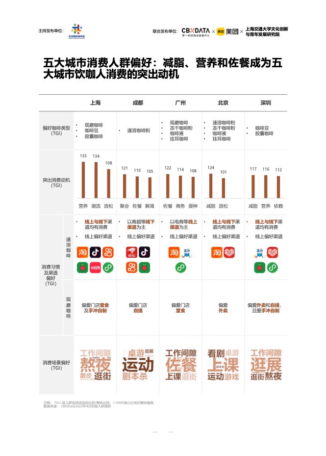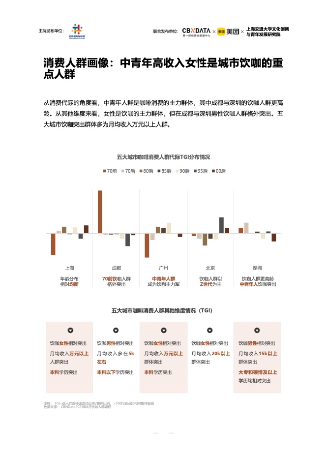 在消费者画像方面,中青年和女性是咖啡的主要消费者。月均收入1万元以上的高收入高学历人群,是五大城市典型的咖啡消费者。不同城市的消费者有自己的口味。上海的消费者喜欢现磨咖啡和咖啡豆,而成都的消费者在聚会和用餐时喝咖啡。