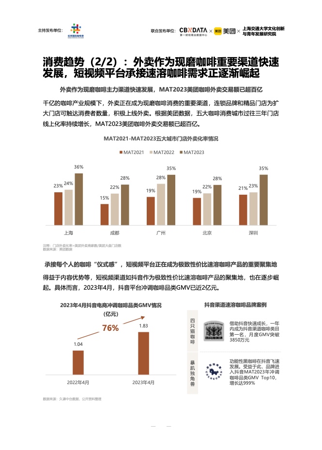 随着咖啡饮用习惯的深入,咖啡产品的供应变得更加多样和丰富。其中“高性价比咖啡”迅速凸显市场包围圈,进一步推动咖啡的普及。外卖也成为咖啡消费的重要渠道,连锁品牌和精品门店都在积极地将外卖搬上网。短视频平台也正以极致的性价比成为速溶咖啡产品的重要聚集地。