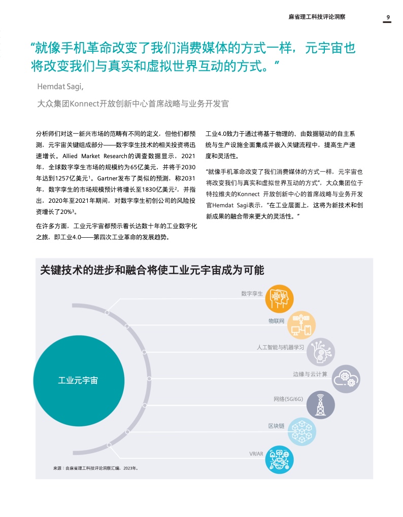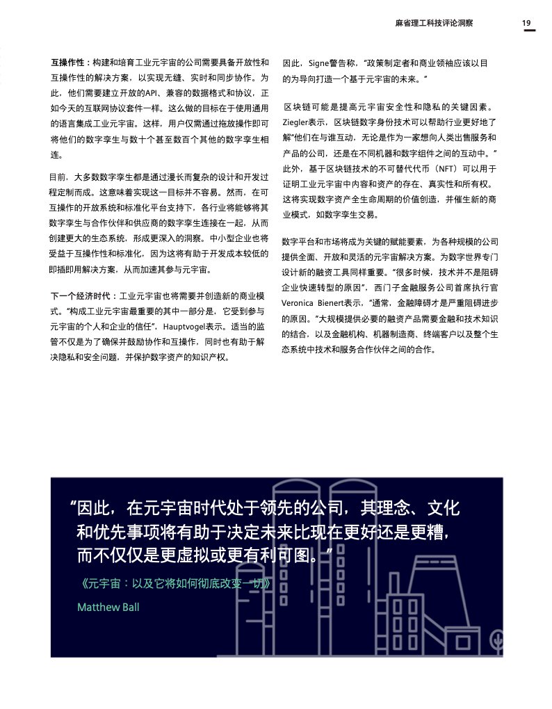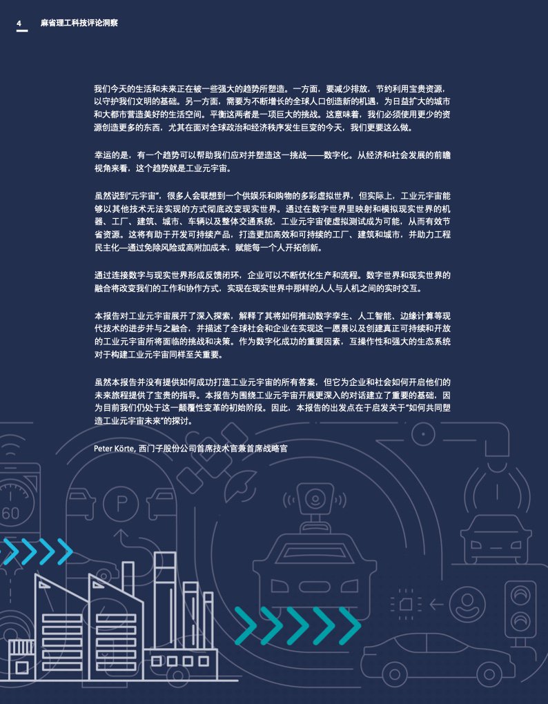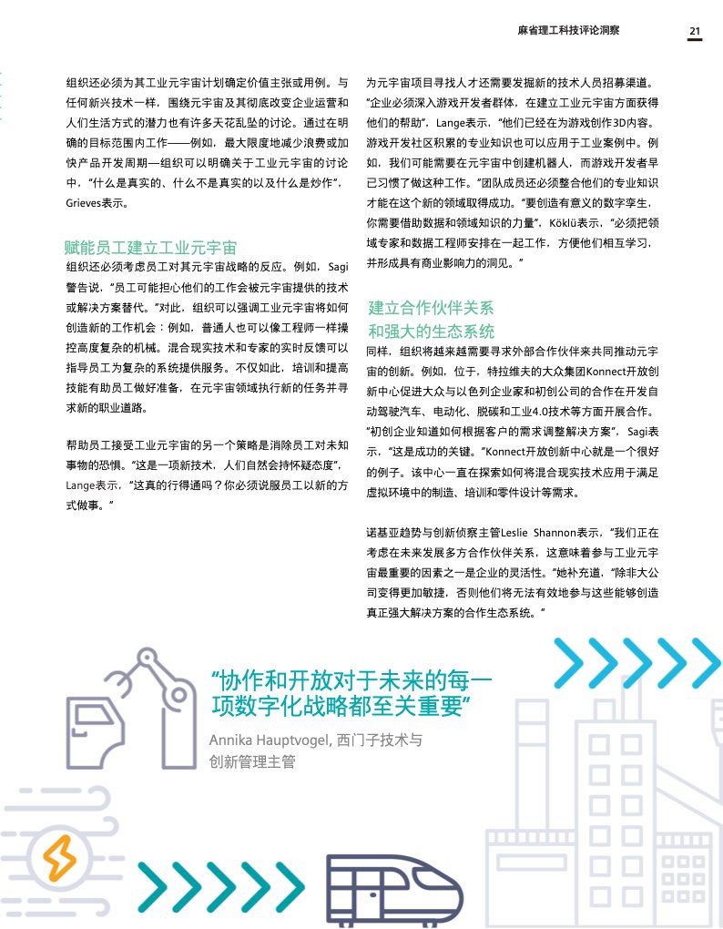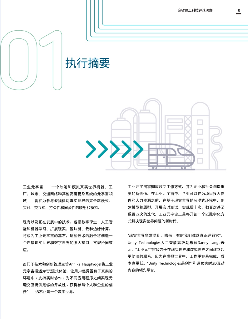 这份报告深入探讨了工业元宇宙,解释了它将如何促进数字双胞胎、人工智能和边缘计算等现代技术的进步和融合,并描述了全球社会和企业在实现这一愿景和创建真正可持续和开放的工业元宇宙时将面临的挑战和决策。作为数字化成功的一个重要因素,互操作性和强大的生态系统对于构建工业元宇宙也至关重要。