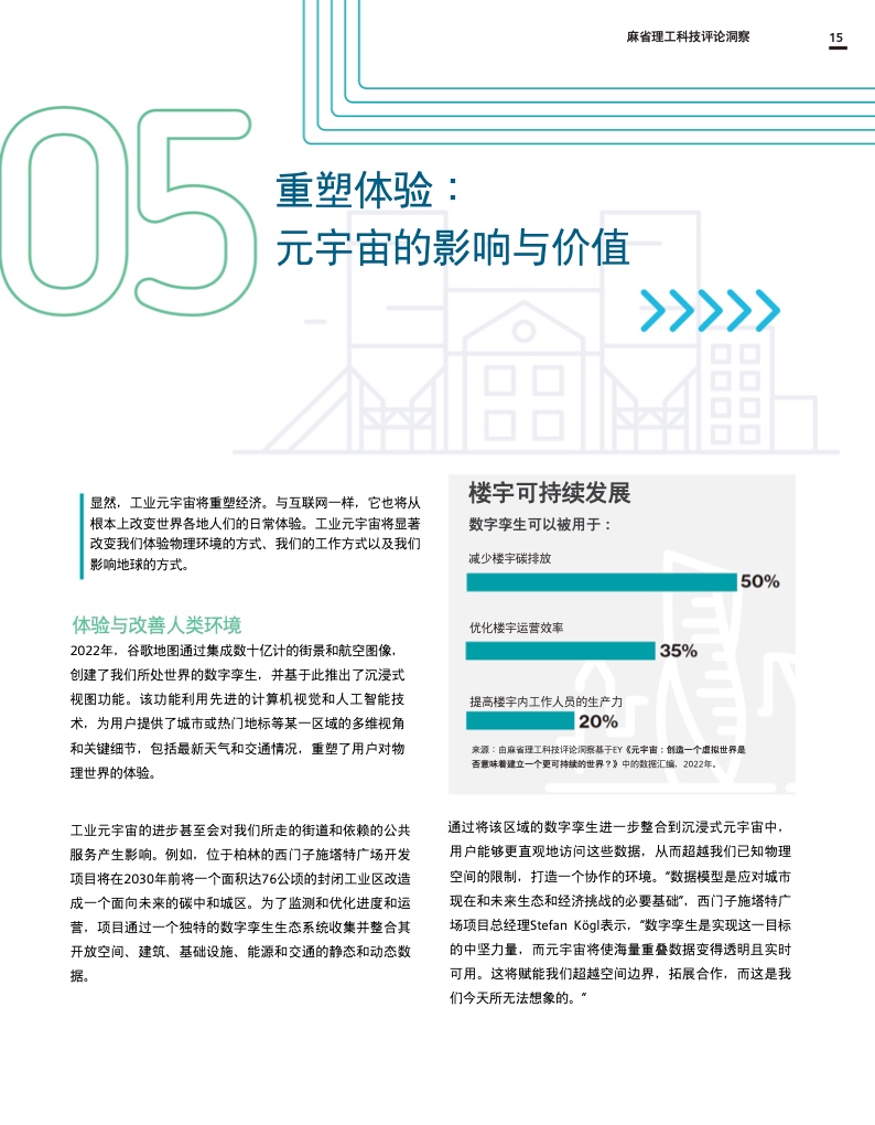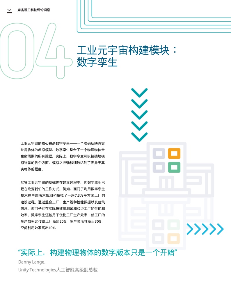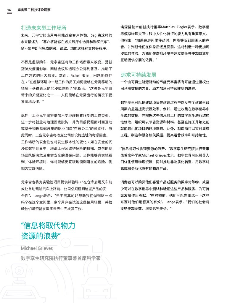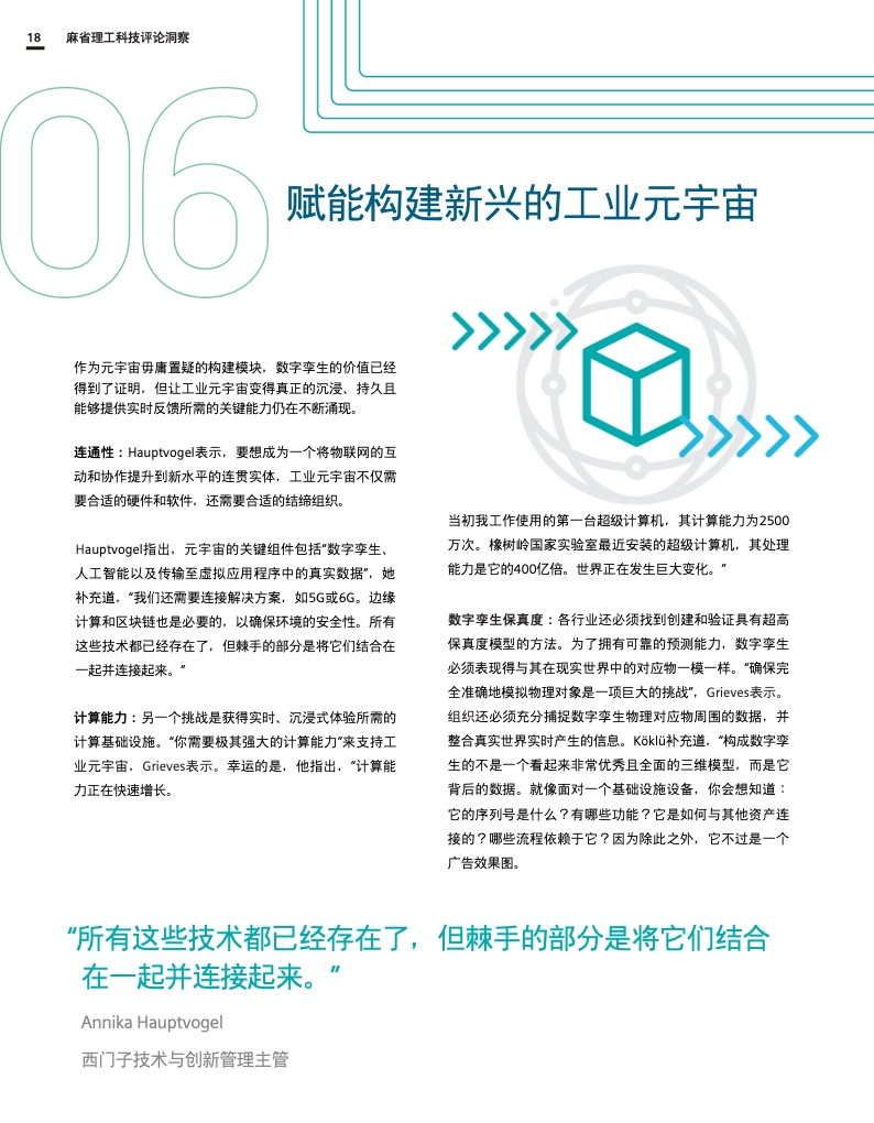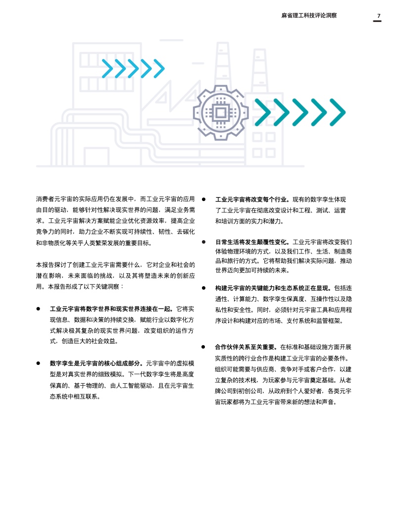 这份报告深入探讨了工业元宇宙,解释了它将如何促进数字双胞胎、人工智能和边缘计算等现代技术的进步和融合,并描述了全球社会和企业在实现这一愿景和创建真正可持续和开放的工业元宇宙时将面临的挑战和决策。作为数字化成功的一个重要因素,互操作性和强大的生态系统对于构建工业元宇宙也至关重要。