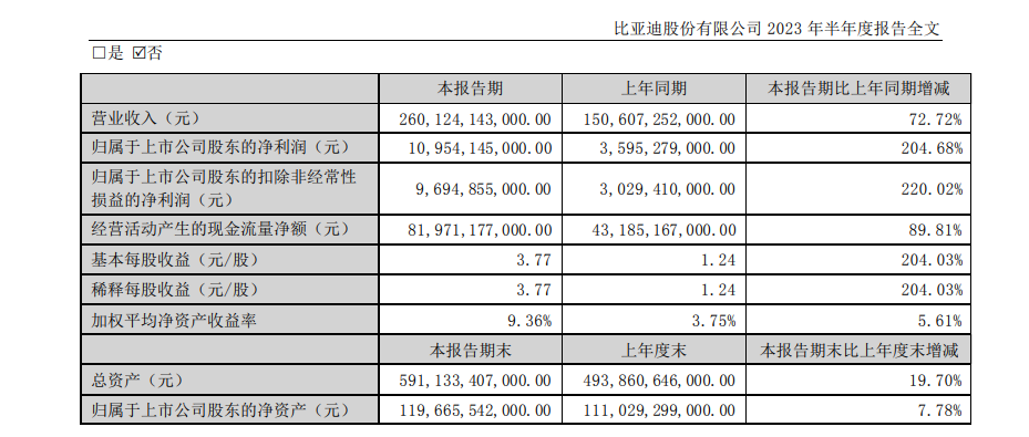比亚迪公布2023年半年报。报告显示,今年上半年,比亚迪实现营业收入2601.24亿元,同比增长72.72%;归母净利润109.54亿元,同比增长204.68%;基本每股收益3.77元。中汽协数据显示,2023年上半年,比亚迪新能源汽车市场份额进一步扩大至33.5%,较2022年增长6.5%,不仅巩固了中国在新能源汽车行业的领先地位,还稳居全球销量第一。